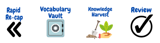 Lessons begin with a Rapid Re-cap revisiting crucial prior knowledge. Children are introduced to carefully selected (tier 2 & 3) vocabulary and lessons conclude with a review to recap sticky knowledge gained throughout the lesson.