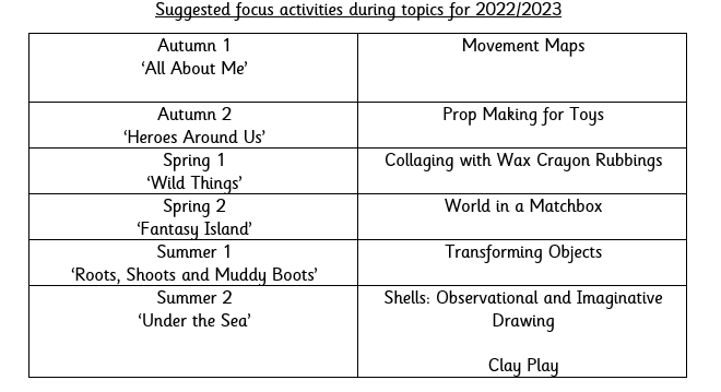 The opportunities in art, provide the children with experiences that focus on 7 areas of exploration: