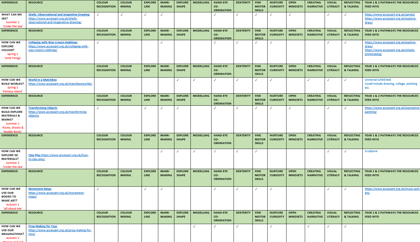Within each of the above areas, we provide activities which enable an open-ended, playful exploration of materials, processes and ideas, which in turn nurture dexterity skills, promote an early understanding of visual literacy skills, and begin to build the child’s confidence in their ability to make a personal, creative response to a stimuli. Together these opportunities provide a foundation for pupils to develop their skills further though KS1 and KS2, following the Access Art Primary Art Curriculum.