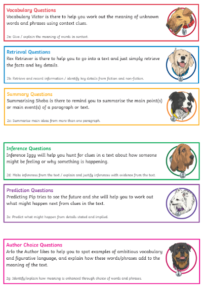 Each session focuses on a key skill using our reading dogs and school reading approach and ensure the teachers can model approaches to finding answers within texts and explaining processes. Children are encouraged to try a range of techniques when forming meaning from texts such as: