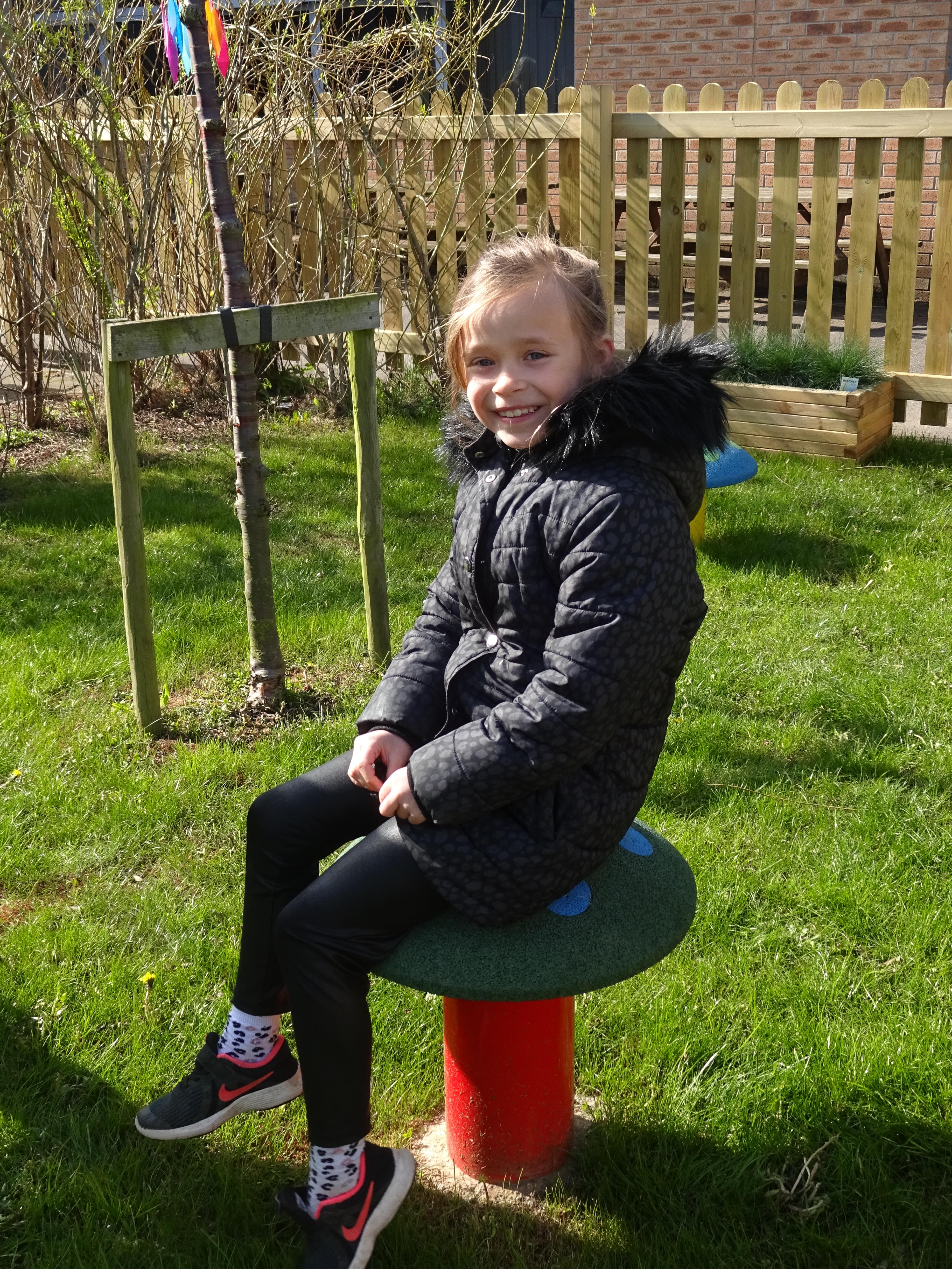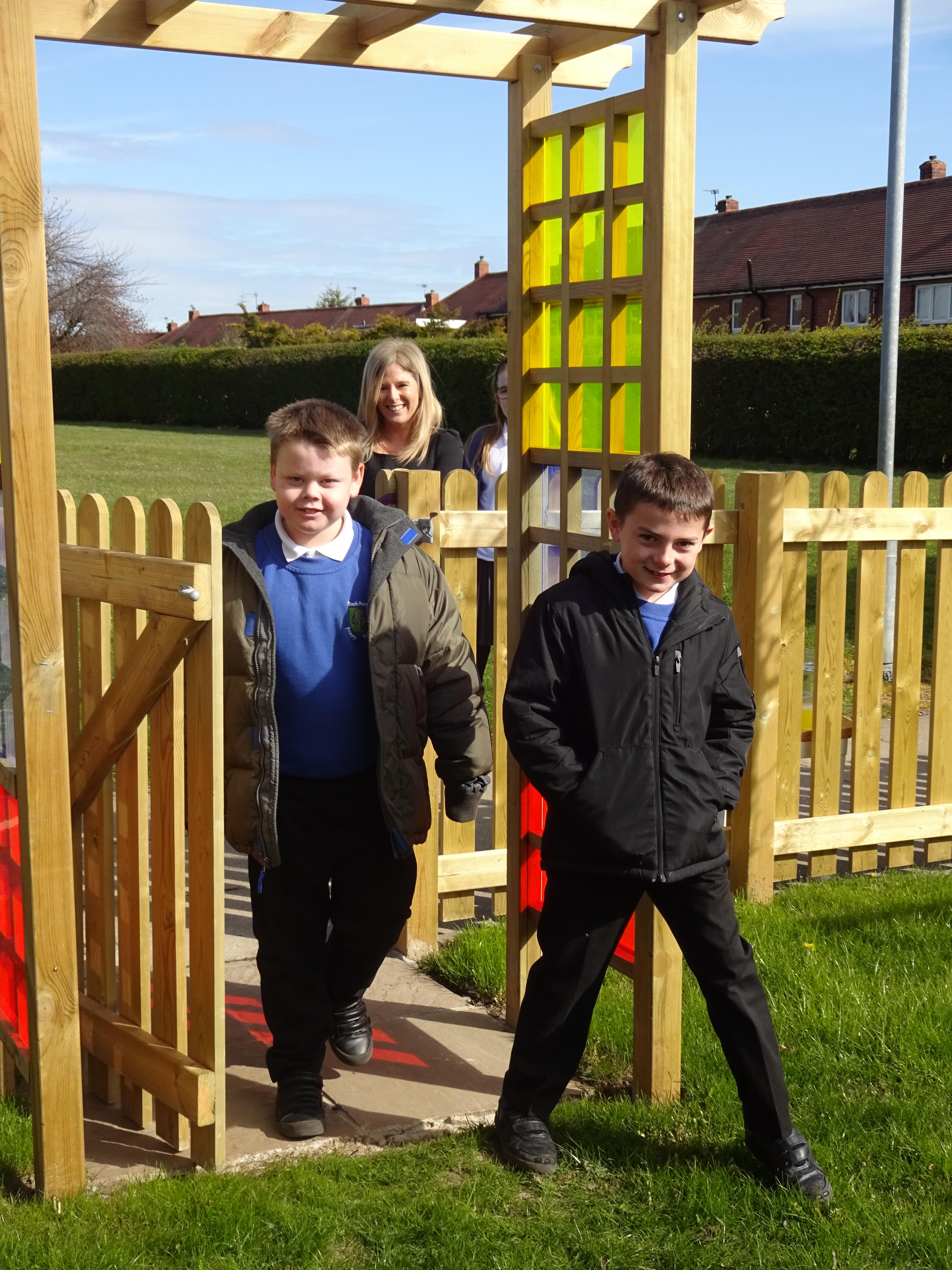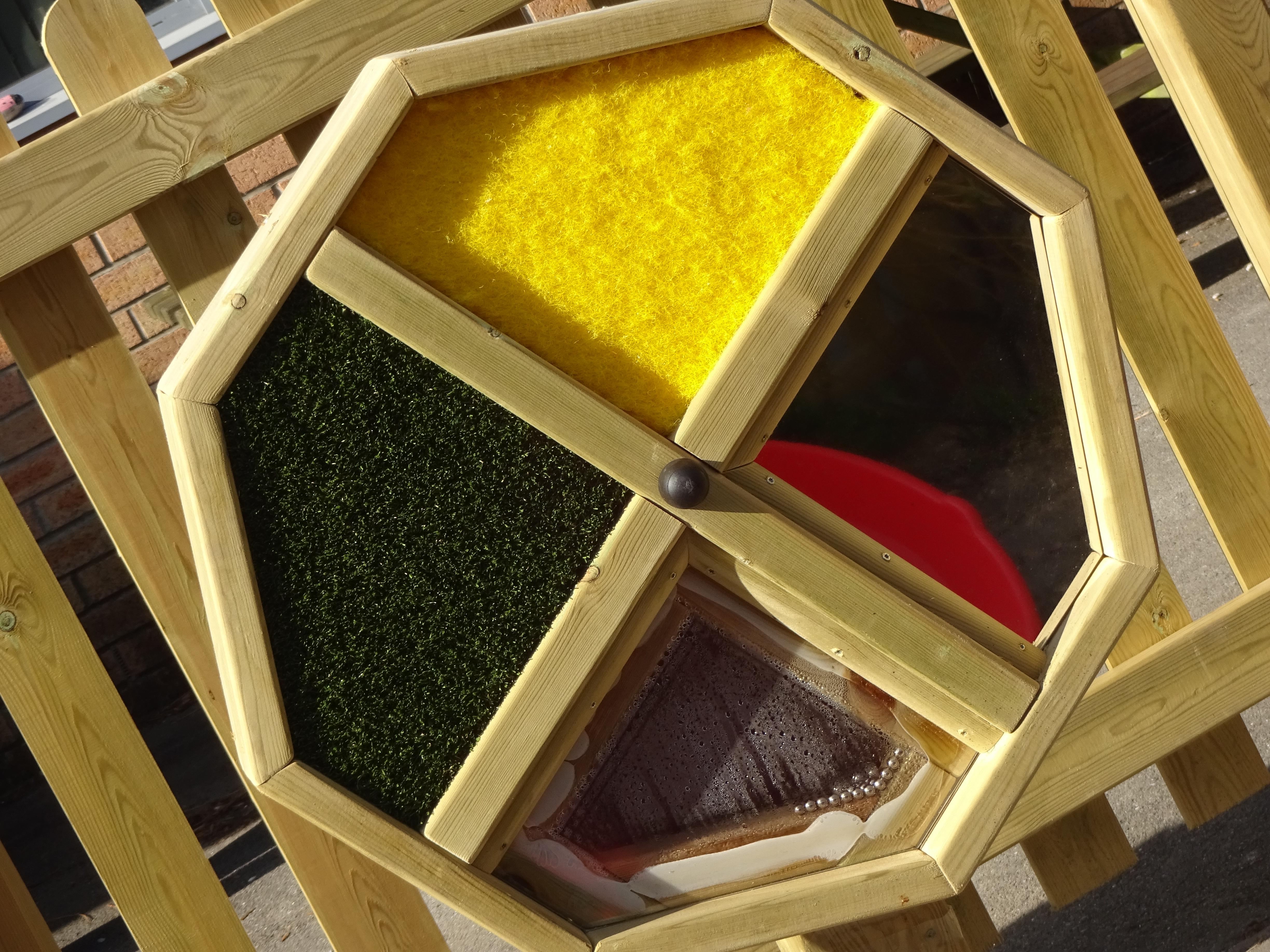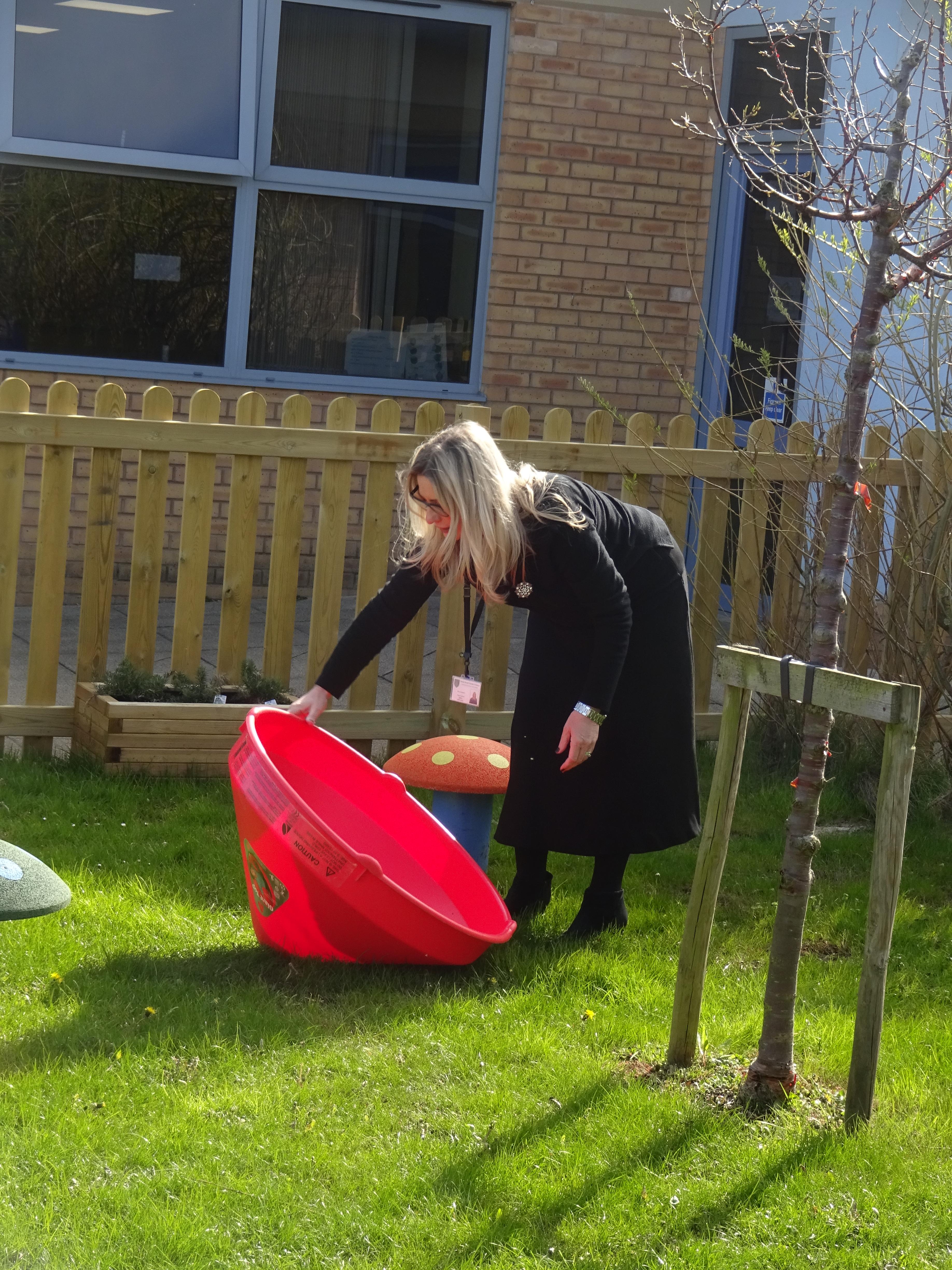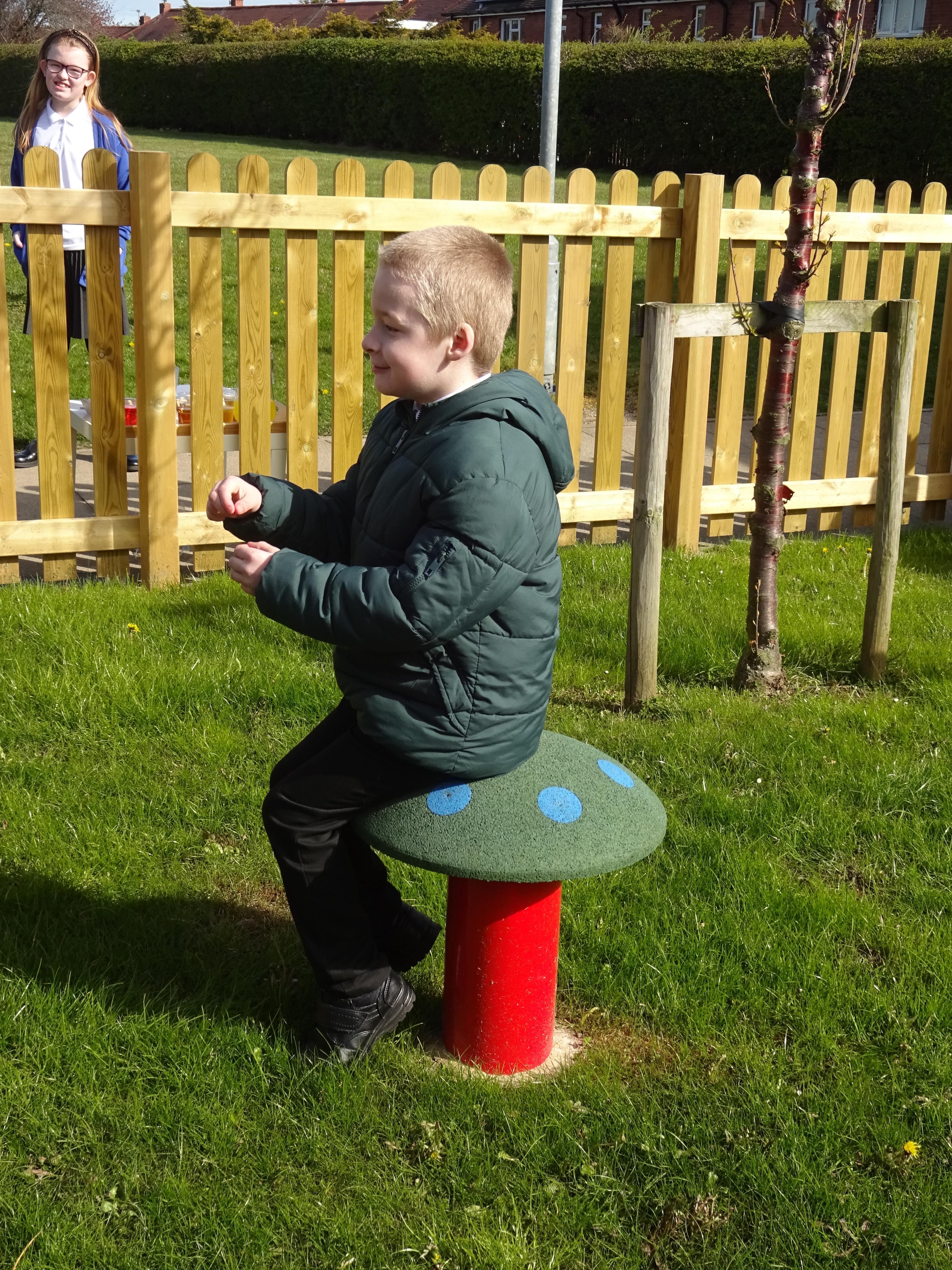 Our beautiful Sensory garden is now open! This is an area in school for any of our children to access where they will benefit from stimulating their senses whilst in the fresh air. This private, enclosed area is accessed through a perspex arch way that scatters colours along the pathway and then there are textured toadstools seats and trees scattering the lawn. The gazebo in the corner is a quiet area for the children to sit on the bean bag and read all obout feelings and choices or to just have calm time. The cobbled area houses the Musical chimes and Sensory windmill and the Giant Top strengthens muscles and body control. The Talking flowers encourage communication so that the children can talk to each other from opposite ends of the garden. There are fragrant herbs and tactile grasses planted and wind chimes hanging in the trees.