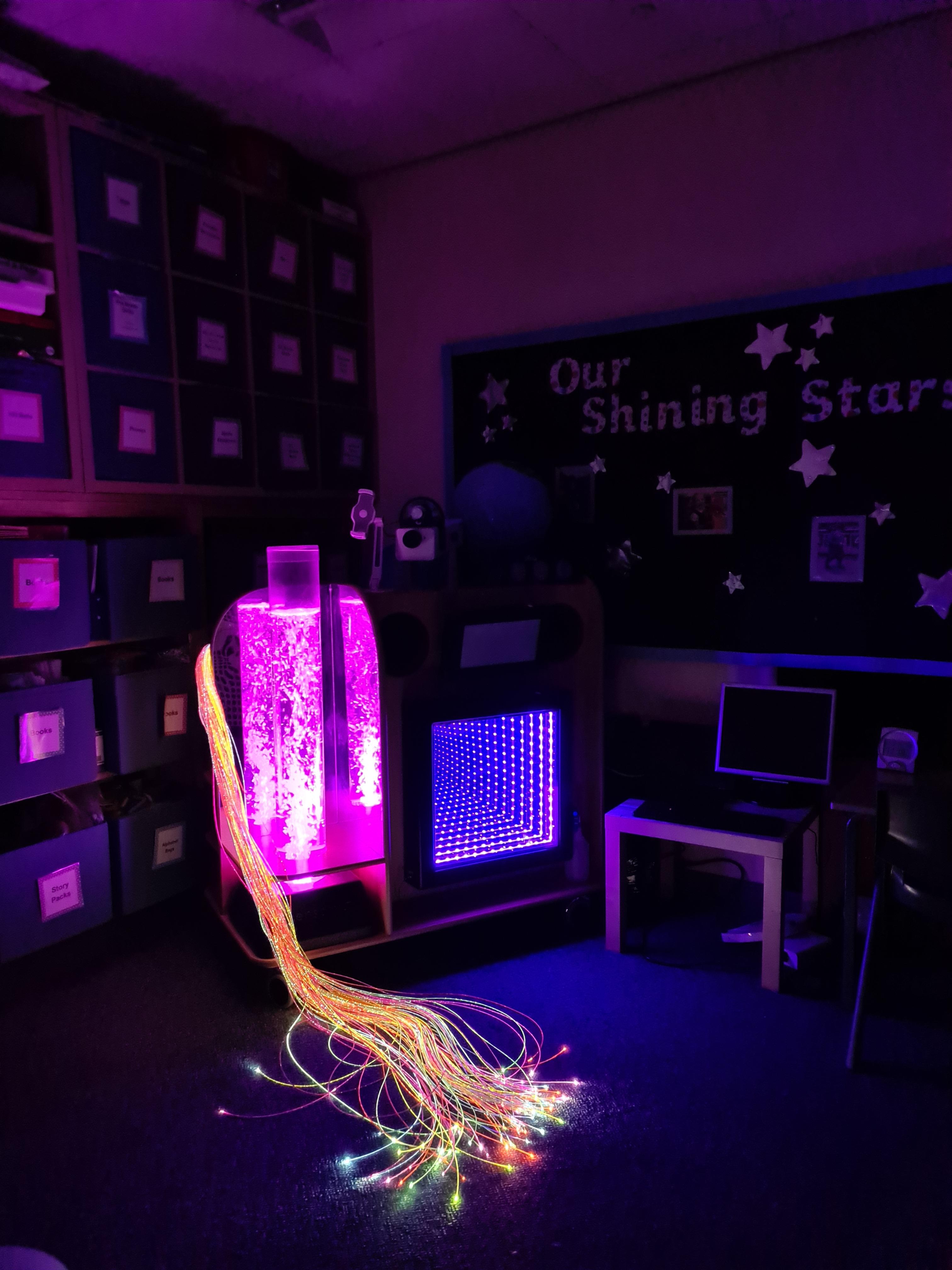 Children have access to our 'Light Room' which is a sensory environment, specifically tailored to VI children, bursting with resources which are often created bespoke, to meet the individual child's needs.