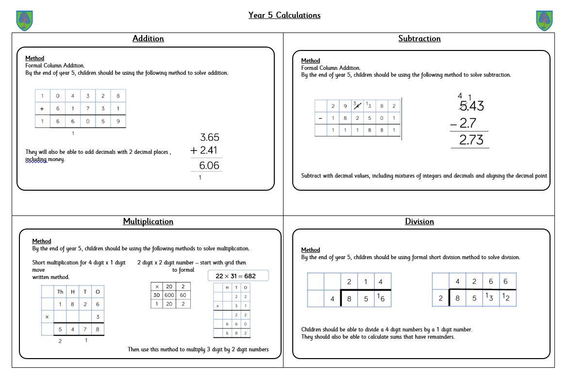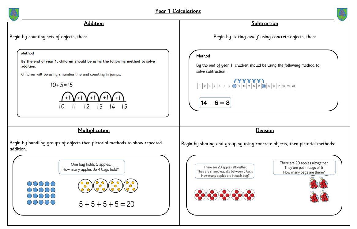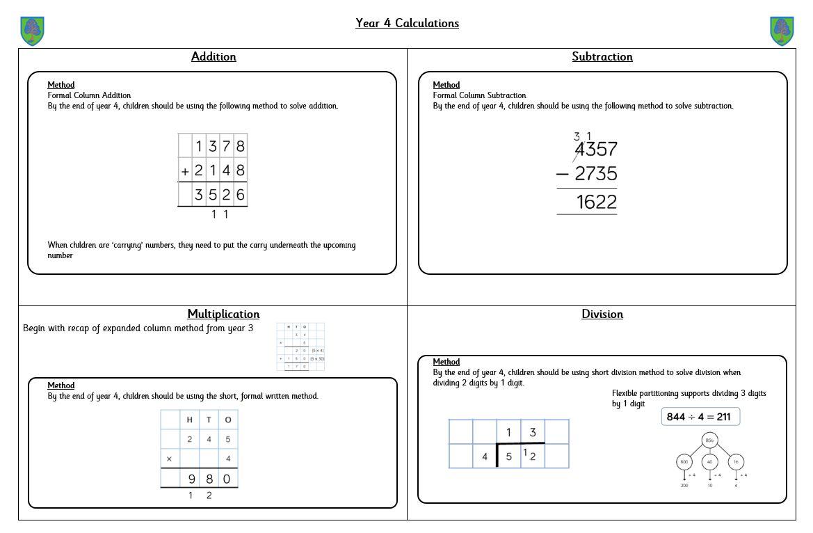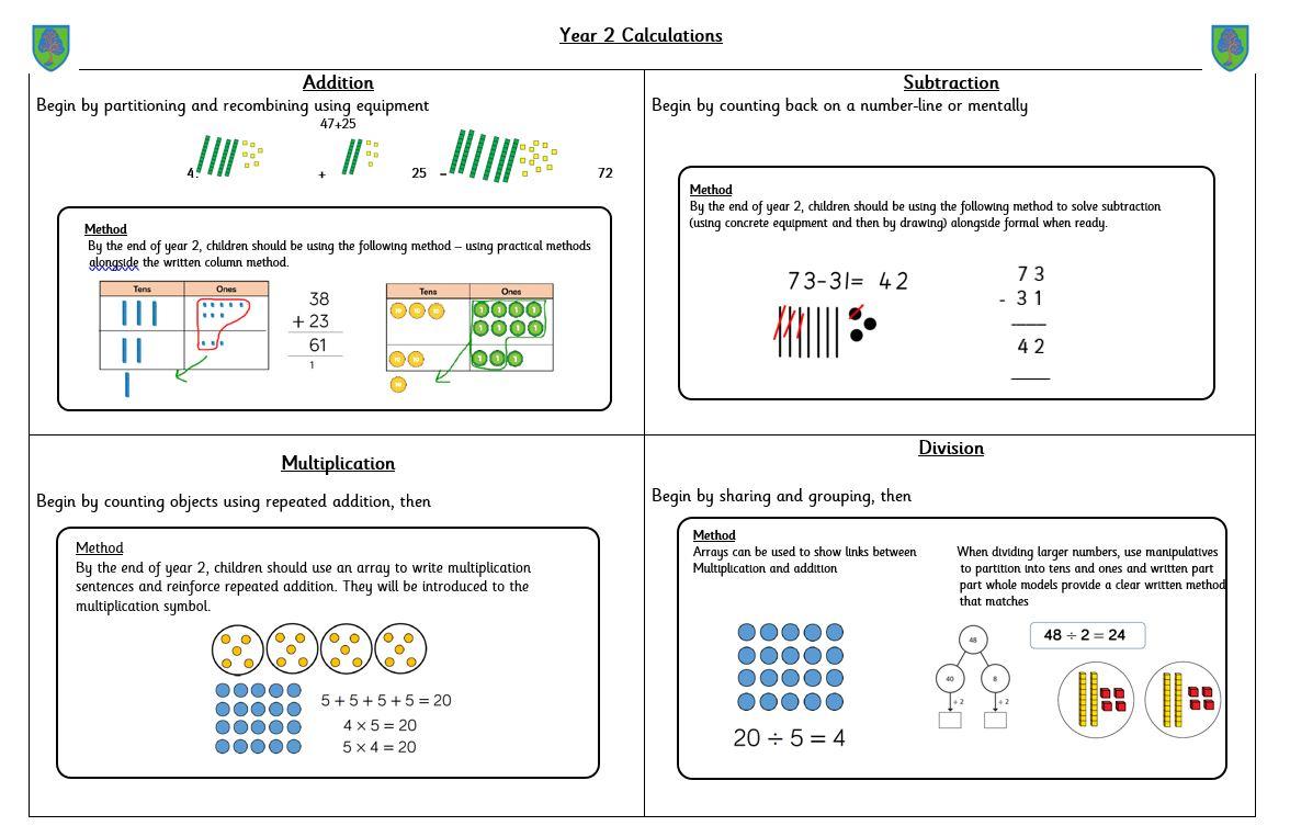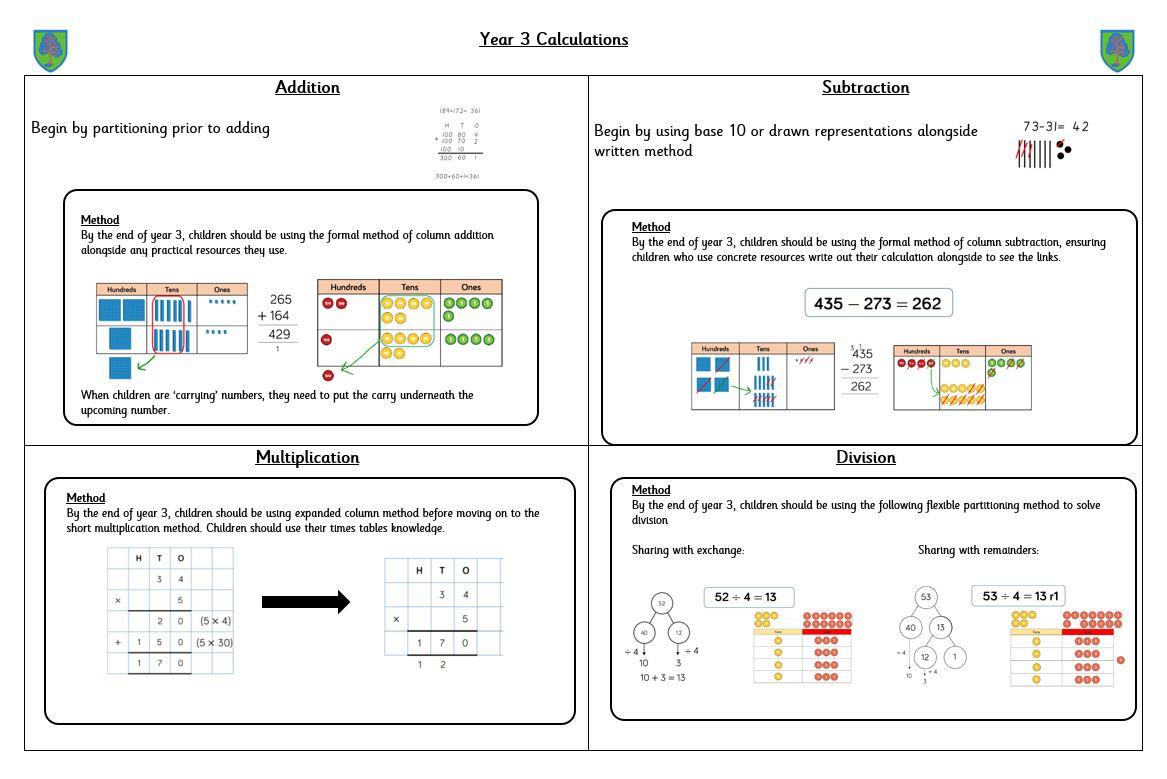At South Parade Primary School, we follow our whole school Calculation Policy to ensure consistency in teaching children written methods for addition, subtraction, multiplication and division. Each year group builds upon what has previously been taught. All children are taught how to answer calculations quickly and fluently. They are also taught how to solve problems using calculations. This starts with one-step problems and moves on to multi-step problems. The document below shows you the method expected by the end of each year group. We hope this is helpful as you support your child at home with their learning.